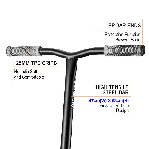 STUNT SCOOTER MAAT-58,5 cm hoog x 47,4 cm lengte T-vormig scooterstuur met een 11,3 cm breed x 51 cm lang dek. De hoogte vanaf de grond tot het stuur is 82,8 cm. Met slechts 3 bouten om vast te zetten, kunt u beginnen met fietsen in no helemaal niet.