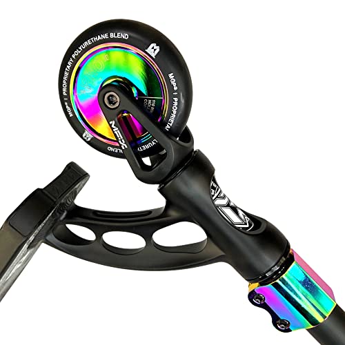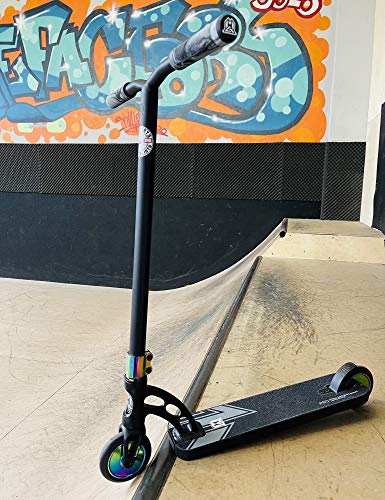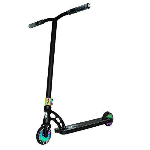 MGP Madd Gear VX10 Pro F26 LTD stuntstep H = 81 cm zwart regenboog De MGP Pro Stunt Scooter is de perfecte step voor jou, als je een complete setup wilt hebben die direct uit de box klaar is voor gebruik. Zonder compromissen wat betreft kwaliteit of specificaties. Of je nu pas begint met het rijden of al de volgende professionele bestuurder bent, de MGO Pro is precies zo ontworpen dat hij echt alles kan uithouden wat je te bieden hebt. Op alle gebieden biedt deze complete scooter talrijke upgrades, die gebaseerd zijn op de ervaring van 9 generaties van de beste technologie en door onze beste bestuurders ter wereld op hart en nieren zijn getest. Dit alles in één pakket dat speciaal is gemaakt voor bestuurders vanaf 6 jaar. Deck: MGP origin 4.5″ B x 19.5″ L Geïntegreerd, ronde box deck stuurelement: MFX Geïntegreerd & verzegeld lager vork: Voltage Draadloos 6061 Alloy 120mm Fork / Standaard IHC klem: 6061 X2 Gemonteerd aluminium dubbel stuur: MGP Low Riser 21″ W x 23″ T 4 031 Japanse Chromoly Bar Handvatten: 150 mm Flangelss MFX Soft TPR Swirls Grind Grips met Nylon Bar-Ends Rem: MFX V2 Composite Blitz Kogellagers: K-2 ABEC 9 High Speed Chrome Diameter: 110 mm Griptape: MGP Pro Full Deck Gewicht: 3,4 kg Gewichts/leeftijdsgrens: 366 kg -100 kg, vanaf 6 jaar