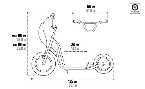 TECHNISCHE GEGEVENS – Max hoogte: 96 cm / Max hoogte vanaf het platform: 85 cm / Min hoogte: 86 cm / Hoogte minimaal vanaf het platform: 75 cm / Totale lengte: 135 cm / Gewicht: 8,5 kg / Gewicht inclusief verpakking: 9,8 kg / De breedte van het stuur: 55 cm / Wielen: Voor 16 “(40 cm) / Achter 12” (30 cm) / Frame: staal / De afmetingen van het platform: 36 x 12 cm / Voettekst: nee / Rem : voor / achter / Max. gebruikersgewicht: 100 kg